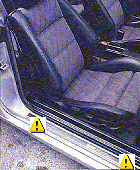 Svetsskarvarna i bak- och framkant under dörrarnas instegslister. Lyft bort instegslisterna i plast som sitter med clips och titta under dessa. Rosten börjar i svetsskarvarna och det rostar snabbt hål om man inte gör något åt det.